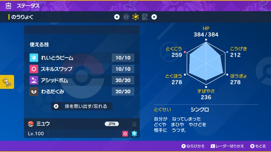 NPCの「いかく」を狙うことで「特殊技にしぼる」ことは可能な選出ではありますが…。どちらかと言うと、私はミュウをおすすめします。